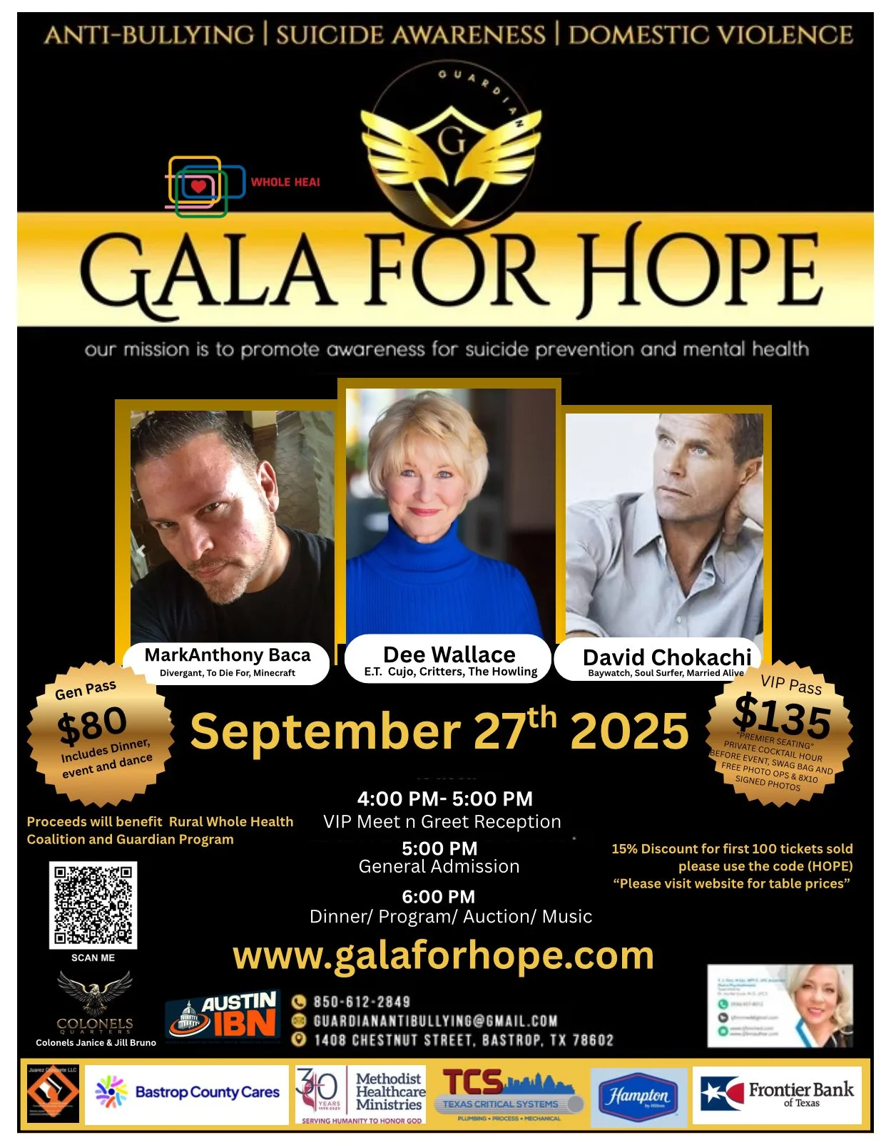 Hollywood Gala for Hope is our first event of its kind here in Bastrop, Texas, marking an exciting new chapter for the community. While Galas themselves are not new to Bastrop, our goal is to bring not only the glamorous and captivating Hollywood vibe but also to create a meaningful gathering that unites people from surrounding cities and neighboring communities. This special Gala is dedicated to addressing and actively helping to reduce the negative consequences caused by bullying and domestic violence. At the same time, it aims to offer hope, healing, and support to those who may feel overwhelmed, isolated, or are struggling to hold on to the precious gift of life that we all cherish so deeply.
